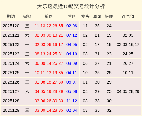 后区分析:近十期后区奖号的大小比为11:9,上一期开出小小数02、04,本期关注后区开出大大数09、10。