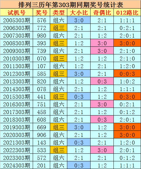 组选类型推荐:历史上排列三第303期同期奖号中,组六出现13期,组三出现7次,今年第303期预计奖号为组六号码。