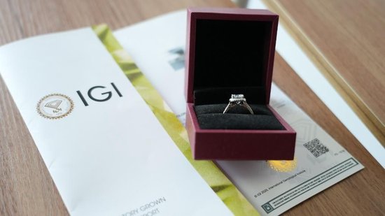 带着疑问,记者以150多元的价格从拼多多上一家网店购买了一款2克拉的“培育钻石钻戒”,附带有鉴定证书和礼盒,又在另一店铺花22元购买了一款“莫桑钻大颗收藏级99克拉进口钻石”。